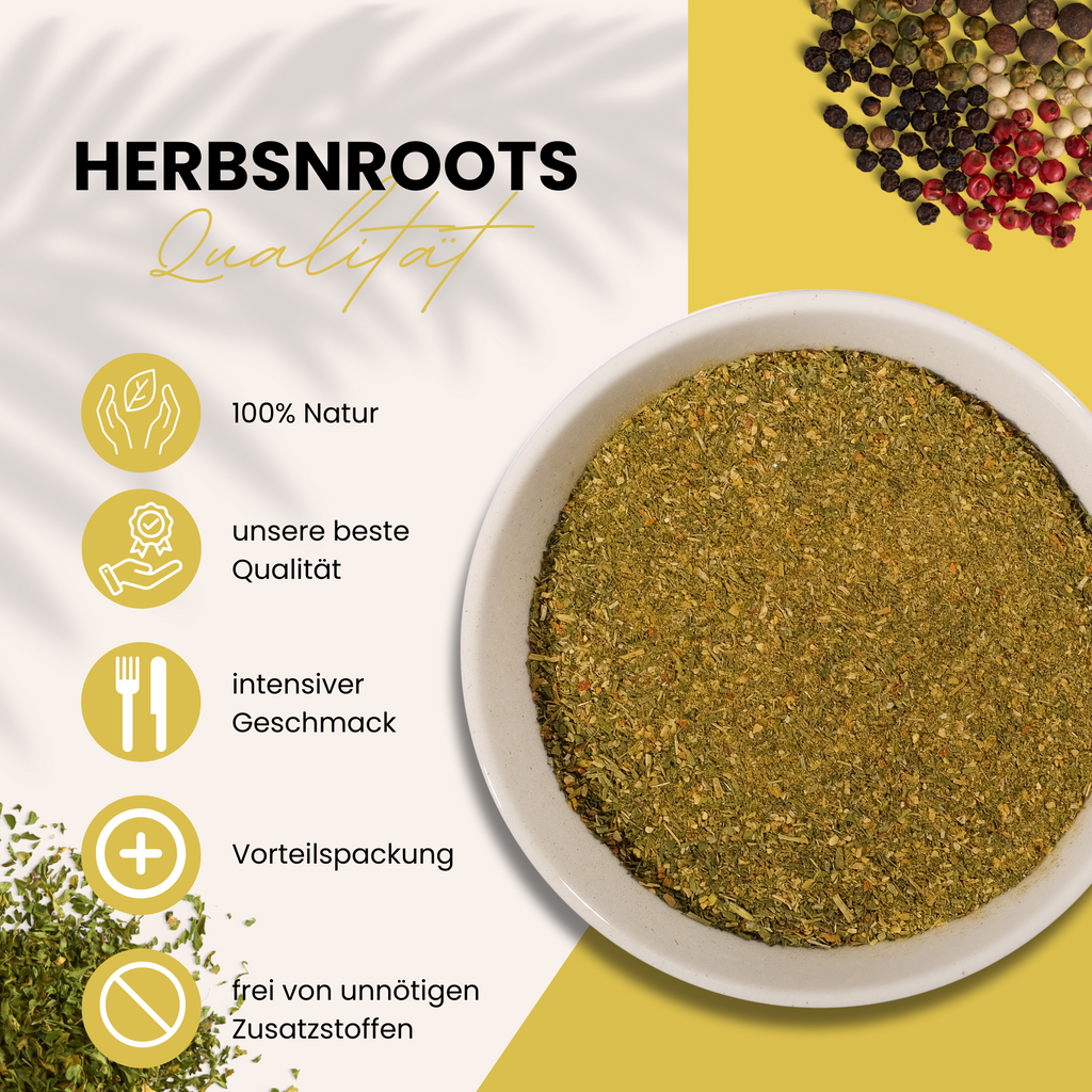 Gewürzmischung Zutaten : Meersalz, Knoblauch, Schnittlauch, Zwiebeln, Oregano, Paprika rot, Petersilie, Majoran, Zucker, Curcuma, Dillspitzen, Karotten, Pastinaken, Liebstöckelblätter, Estragon, Fenchel, Rosmarin, Thymian