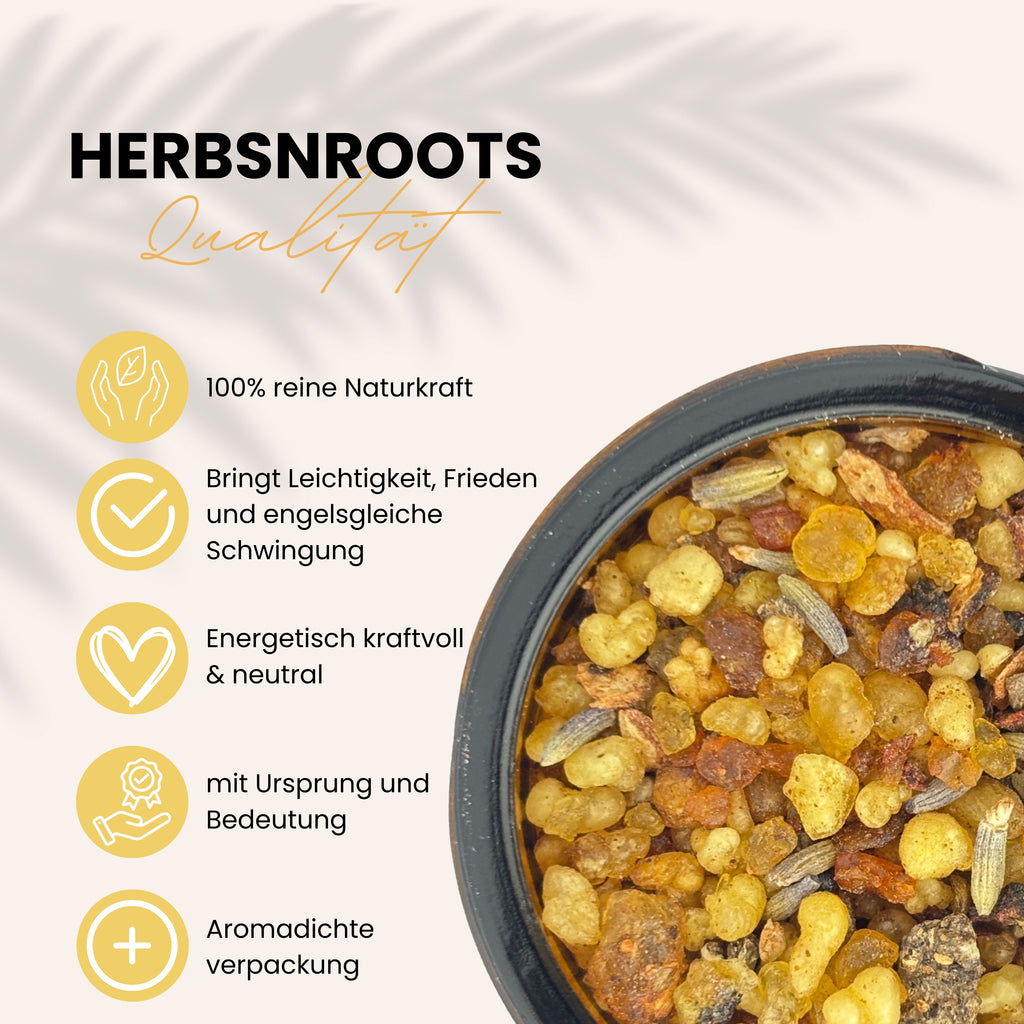 Beim Räuchern entfaltet sich ein klarer, leicht süß-zitroniger Duft, der Räume in strahlendes, harmonisches Licht taucht – wie ein Engel, der sanft über alles wacht.