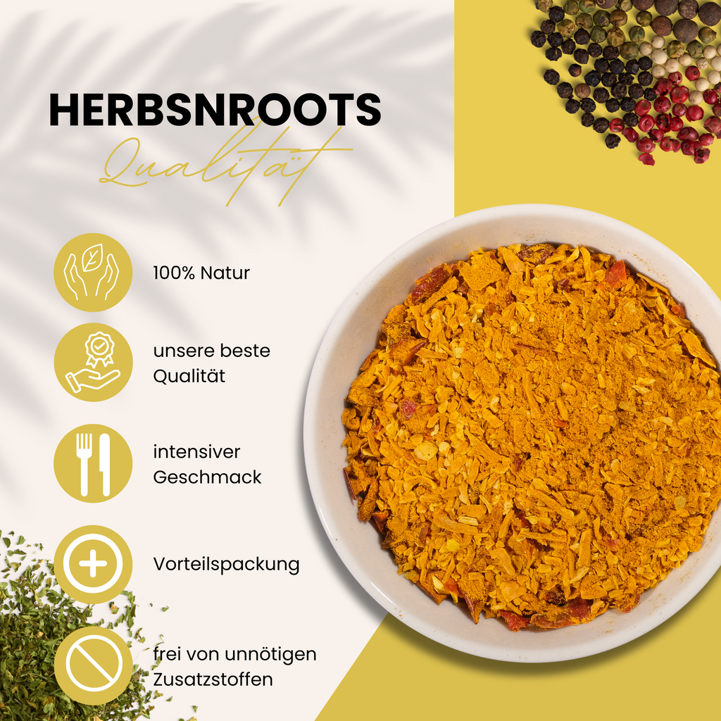 Zwiebeln, Curry (Curcuma, Koriander, Senfsaat, Chillies, Bockshornsamen, Meersalz, Knoblauch, Fenchel), Paprika rot, Liebstöckelwurzel, Curcuma, Ingwer, Cardamon, Cumin, Chillies