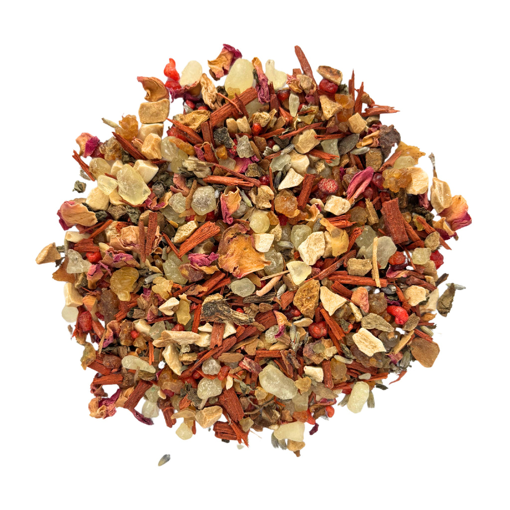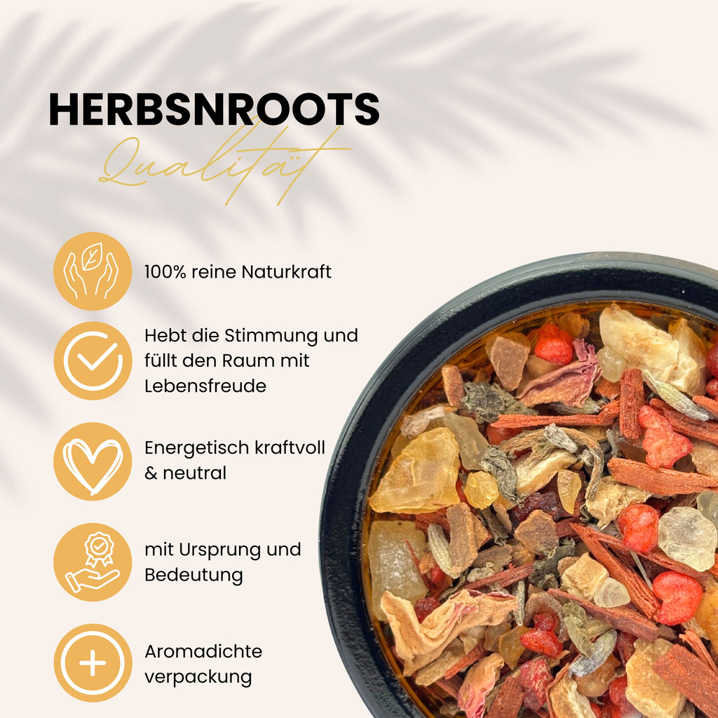 Brenne diese "Feel Good" Räuchermischung an und spüre, wie der Raum mit einer beruhigenden, energetisierenden Aura erfüllt wird. Die perfekte Begleitung für entspannte Stunden, inspirierende Meditation oder einfach nur, um den Alltag mit einem Lächeln zu durchdringen.